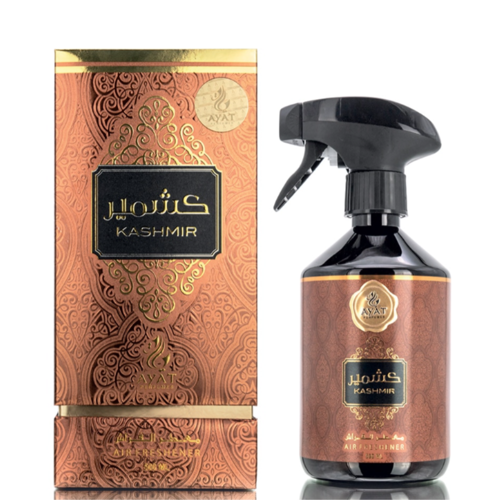 Parfum D’Ambiance KASHMIR 500ml de Ayat Perfumes. Notes de tête: Citron, Ambre, Musc Notes de cœur: Patchouli, Feve de tonka Notes de fond: Oud , Rose .